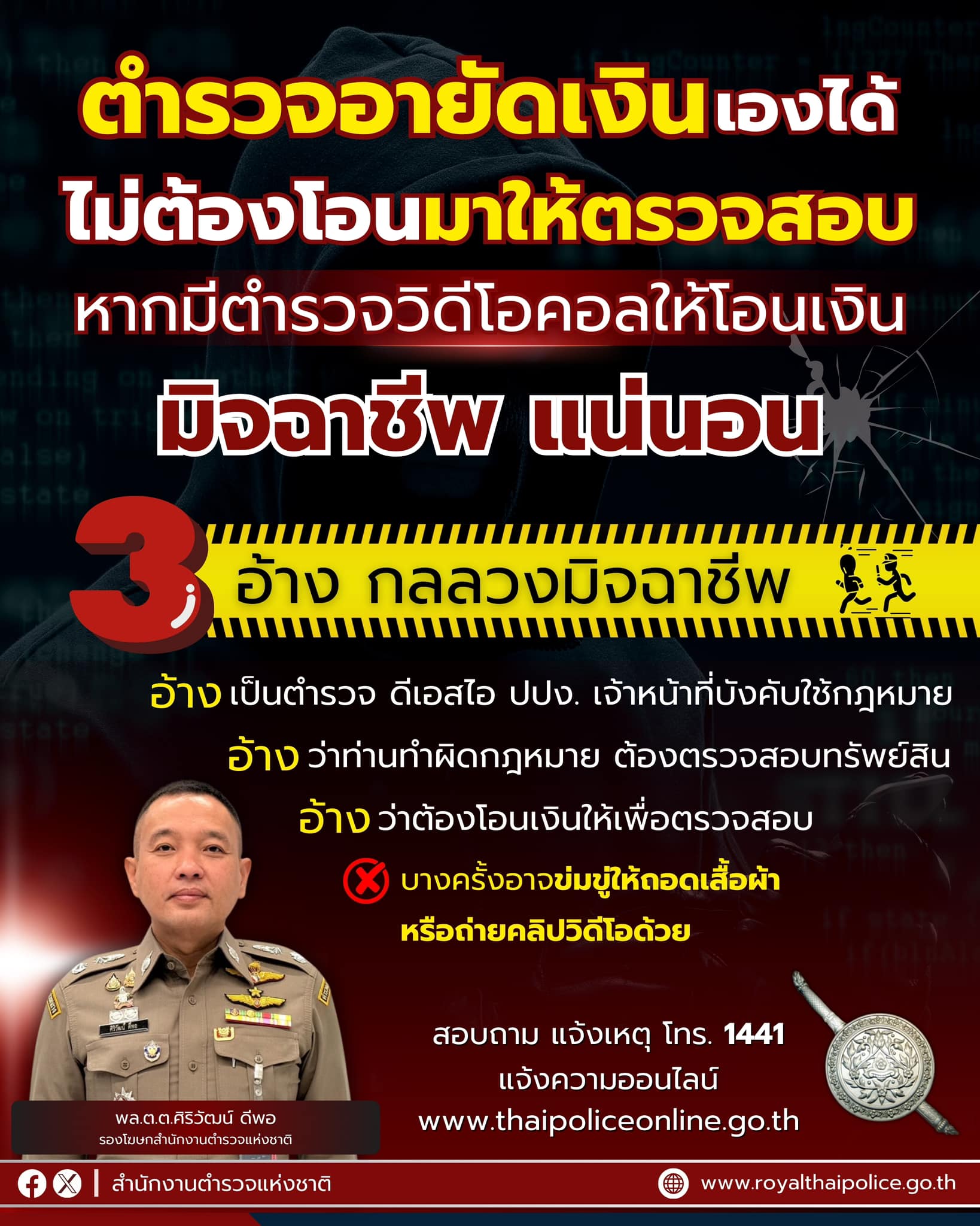 สำนักงานตำรวจแห่งชาติ ย้ำเตือน ตำรวจอายัดเงินเองได้ ไม่ต้องโอนมาให้ตรวจสอบ หากมีตำรวจวิดีโอคอลให้โอน