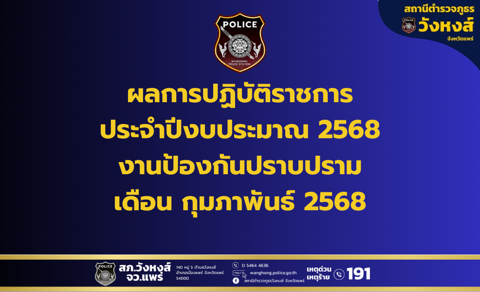 ผลการปฏิบัติงานป้องกันปราบปราม ประจำเดือน กุมภาพันธ์ 2568 เมื่อวันที่ 1 กุมภาพันธ์ 2568 ถึง 28 กุมภา