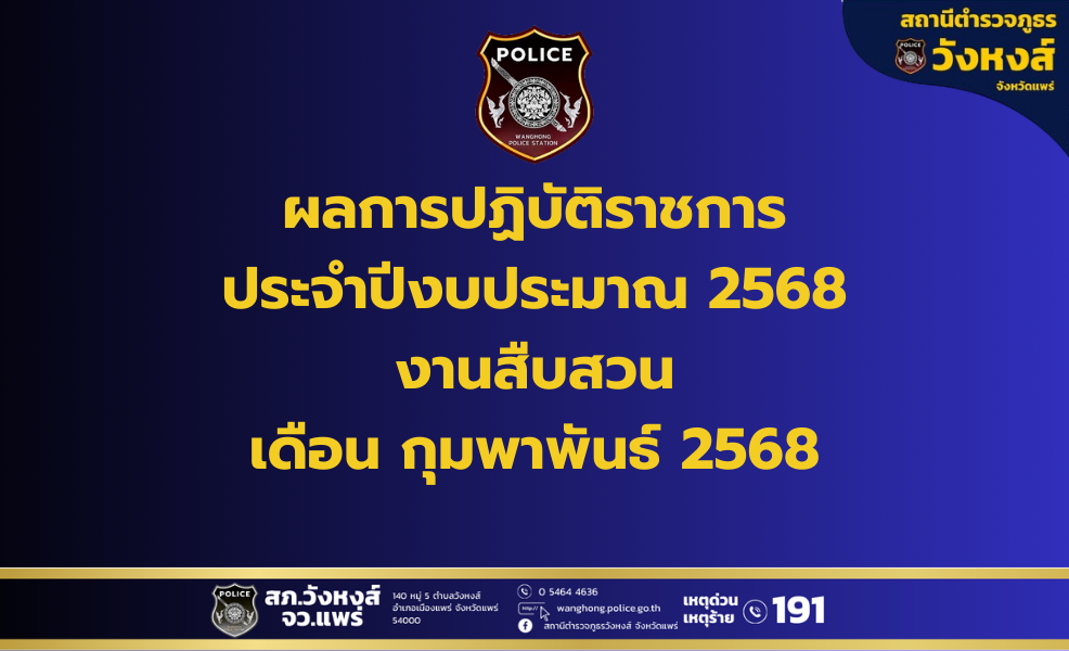 ผลการปฏิบัติงานสืบสวน ประจำเดือน กุมภาพันธ์ 2568 กลุ่มงานสืบสวน สภ.วังหงส์ จ.แพร่ ได้มีผลการปฏิบัติง