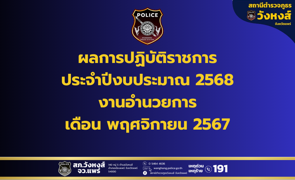 ผลการปฏิบัติงานอำนวยการ สภ.วังหงส์ ประจำเดือนพฤศจิกายน 2567